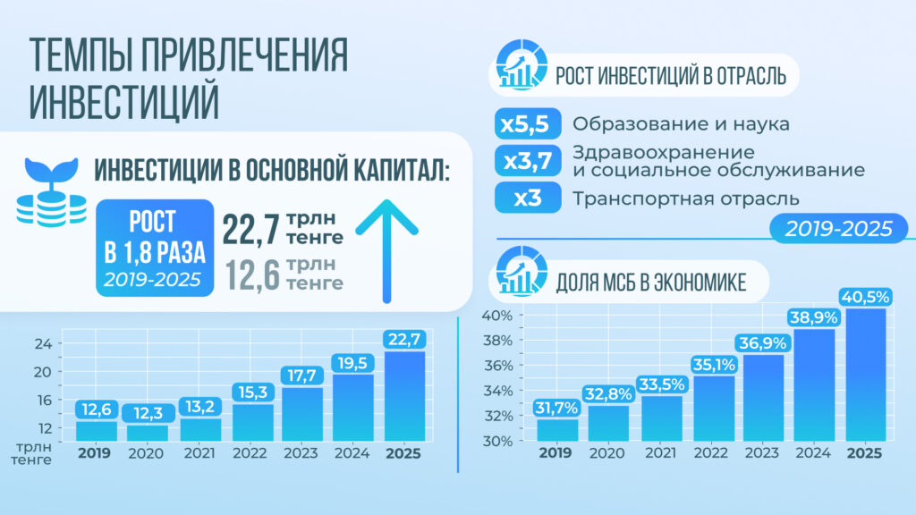 Инвестиционная политика Президента Касым-Жомарта Токаева стала одним из ключевых инструментов трансформации экономики. За семь лет объем инвестиций в основной капитал вырос с 12,6 трлн тенге до 22,7 трлн тенге. При этом существенно изменилась их структура: основной приток средств направляется в обрабатывающую промышленность, инфраструктуру, энергетику, логистику и агропромышленный комплекс.