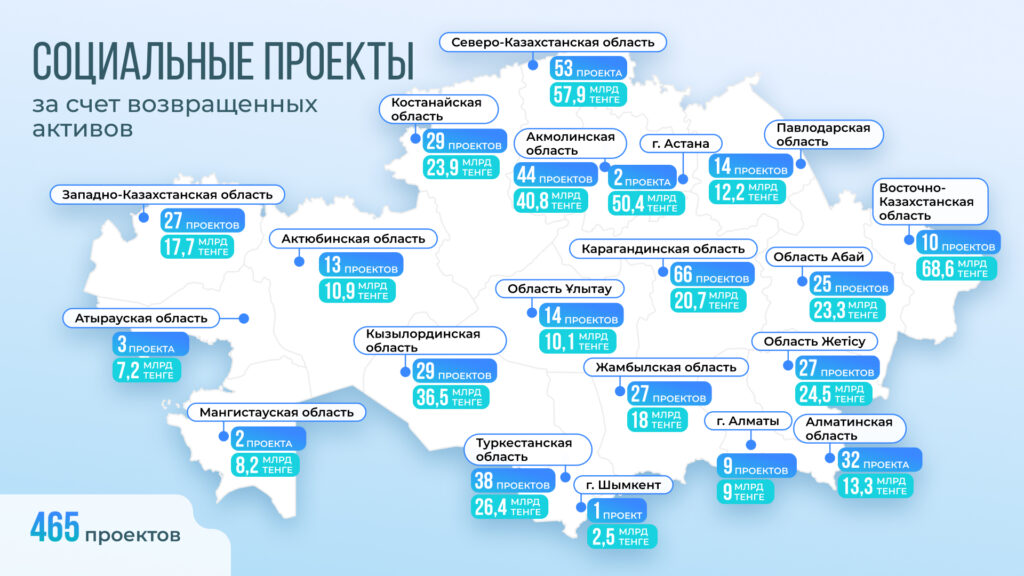 В сфере здравоохранения 183 объекта возведены на возвращенные средства, что дало возможность активизировать темпы реализации национального проекта по модернизации сельского здравоохранения. В результате в рамках нацпроекта в сельских населенных пунктах страны функционируют 655 новых объектов первичной медико-санитарной помощи. Помимо этого, за счет этих средств ведется строительство крупных медицинских центров, включая многопрофильную больницу и Центр гематологии в Восточно-Казахстанской области, станцию скорой медицинской помощи в Мангистауской области, операционно-реанимационный блок онкологического диспансера в Карагандинской области.
